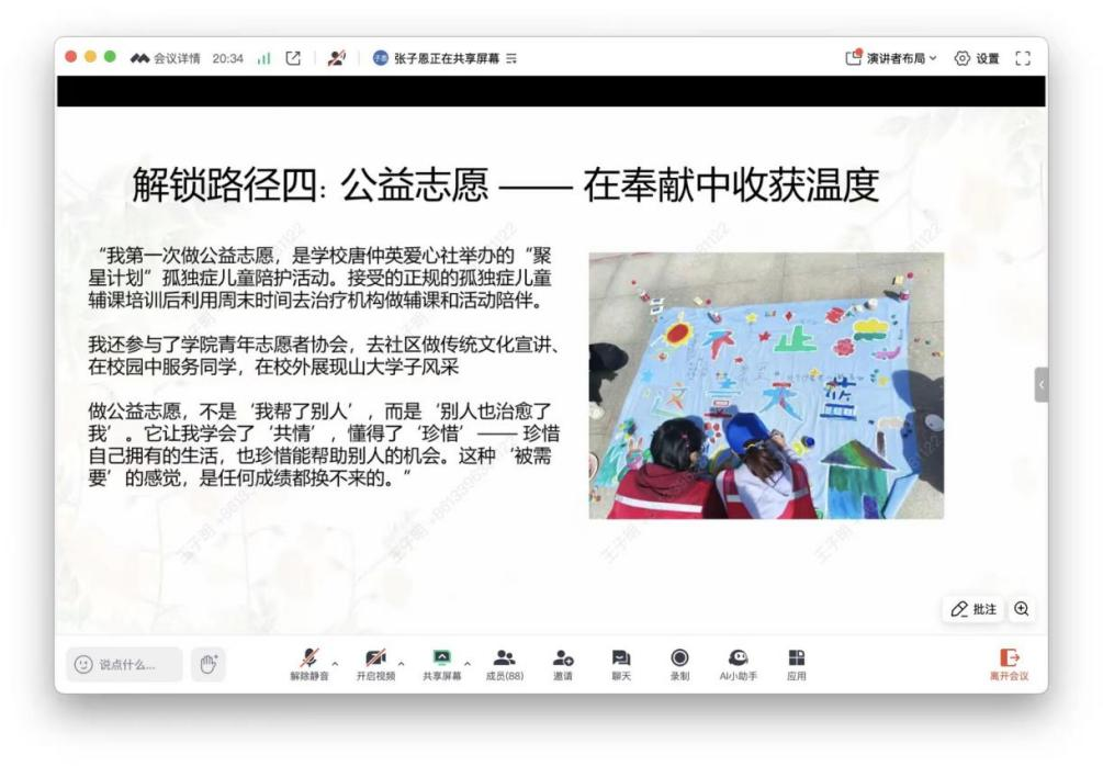 围绕“在大学校园解锁自己的‘N’种可能!”这一主题,员工社团指导中心负责人、历史学院2023级本科生张子恩以亲身参与为主线,从文艺体育活动中的兴趣发现与舞台历练,到社团组织里的项目策划与团队协作,再到社会实践中的调研走访与知识转化,以及公益志愿服务中的奉献体验与素养提升,系统分享了自己在老员工活里通过多元校园活动挖掘潜能、学习新知、结交朋友、全面成长的丰富历程。