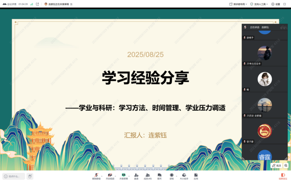 国家奖学金获得者、历史学院2022级本科生连紫钰以“学业与科研:学习方法、时间管理、学业压力调适”为题分享学习经验,从日常学习入手,详细解读课前预习、课中笔记、课后复习、期末复习四个重要环节。期间,她就书籍阅读、时间管理、未来规划等内容与同学们交流,鼓励大家珍惜时间、把握当下, 明晰目标、脚踏实地。