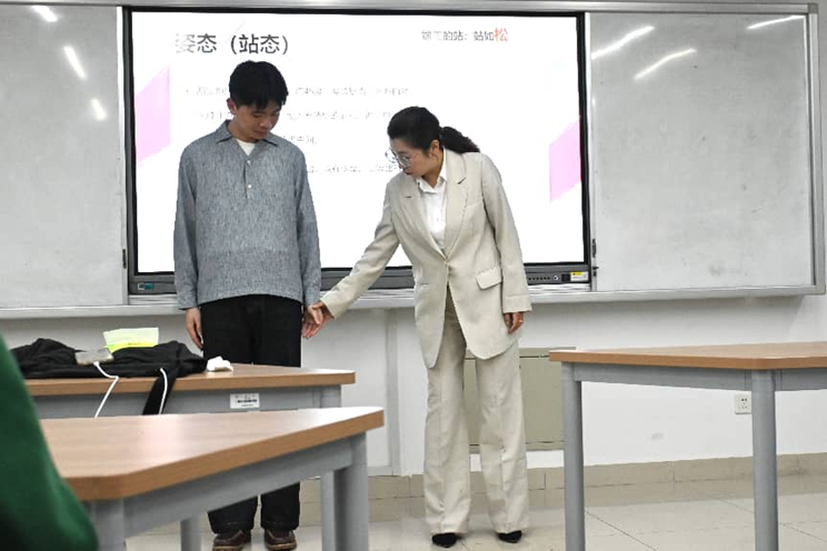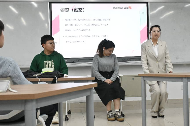 随后,高娜就职场社交礼仪和社交心态进行了分享。她提醒同学们关注职场的细节,如表情管理、敲门礼节等,强调真诚与尊重是职场交往的重要基石。她还邀请同学上台示范,现场指导正确的站姿与坐姿,帮助大家在实践中掌握规范的仪态礼仪。最后,高娜鼓励同学们通过日常的行为与语言练习,逐步培养自信、热情、专业的阳光心态,以积极从容的姿态迎接职场挑战。
