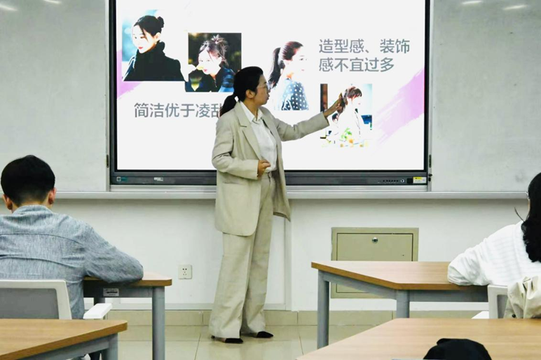 首先,在形象塑造方面,高娜从心理学角度强调了第一印象的重要性,指出在职场上塑造“干练”形象有助于在短时间内赢得他人的信任与尊重。她围绕发型、妆容和着装,详细介绍了职场中规范的形象管理礼仪。发型应整洁利落,体现精神面貌;妆容以清透自然为宜,展现良好皮肤状态与职业气质;着装则重点介绍了职场穿搭的TPOR原则,即根据时间、场合、地点与角色进行精准搭配。高娜结合大量实例,讲解了职业装的选择标准、颜色搭配技巧以及配饰使用规范,并通过现场示范,直观展示了符合职场审美的穿搭效果。